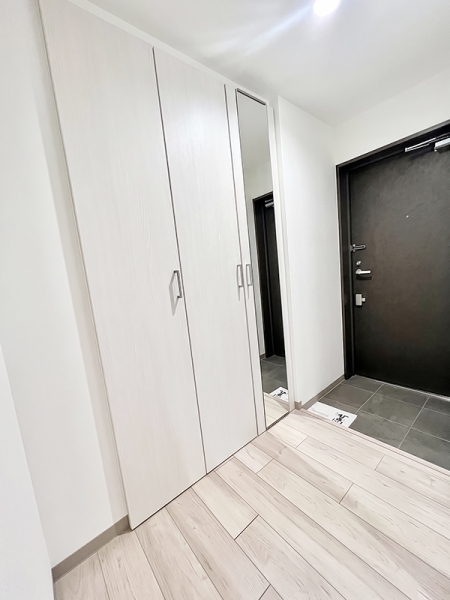 全身鏡がお出迎え。ダークなドアカラーとホワイトの収納の