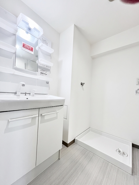 清潔感のある仕上がり。独立した洗面台には三面鏡と