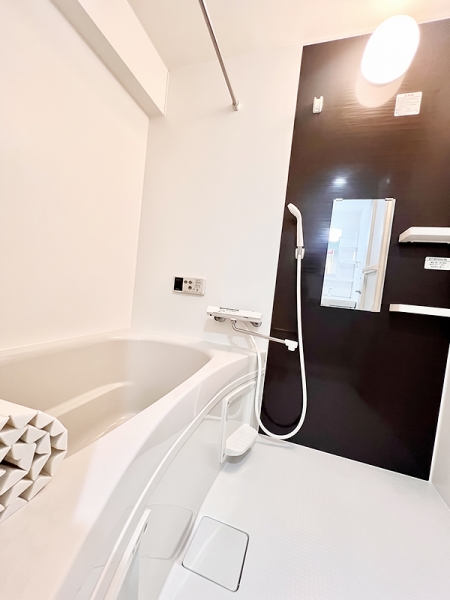 浴室はダークブラウンのパネルと白いバスタブのコントラストが印象的。