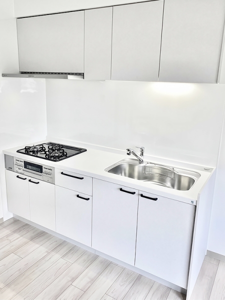 キッチンは白を基調にしたシステムキッチン。3口ガスコンロと