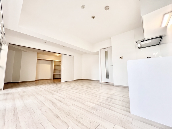 別角度から見ると、LDKの奥にオープンシェルフタイプの