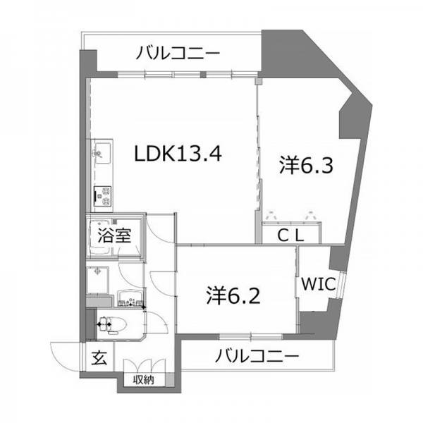 2つのバルコニー、2か所の洋室、WIC付きという間取りの