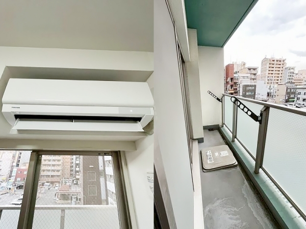 バルコニーは東芝のエアコンも設置済みで
