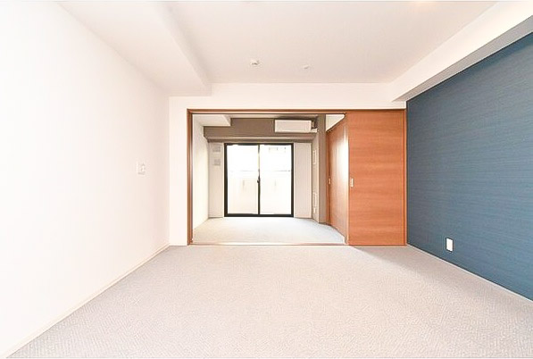 ブルー壁が爽やかなアクセントになったお洒落なお部屋。