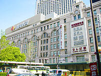 高島屋大阪店 南海難波駅大ビルディング(現在地)。久野節建築事務所設計、大林組施工 コリント様式の近代名建築。地下2階、地上7階建て 約33,000m2。日本初の冷暖房を装備した百貨店となった。また、日本におけるショーウィンドウを早くから導入した百貨店でもあり、1969年(昭和44年)には、初の郊外店となる玉川高島屋SCを成功させ、その後の百貨店経営のモデルを打ち立てたことでも知られる。バラの花をイメージフラワーとして採用し、現在でも包装紙などに用いられている by Wikipedia